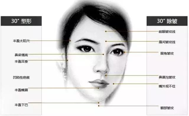 面部范围:泪沟、眼周、苹果肌塑形、提高鼻梁、修饰鼻尖;丰面颊;丰双唇、修饰唇形;修饰下巴等.